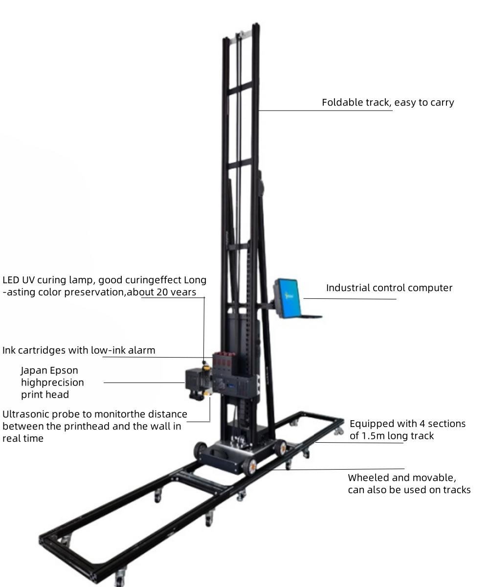 Hanjie printers feature modular construction, laser positioning systems, electric lifting poles for uneven walls, and dual Epson printheads (DX10/I1600) that support up to 2880 DPI resolution. These printers support 3D/5D relief visual effects for a strong three-dimensional effect and use CMYK+W UV inks that are waterproof and fade-resistant.